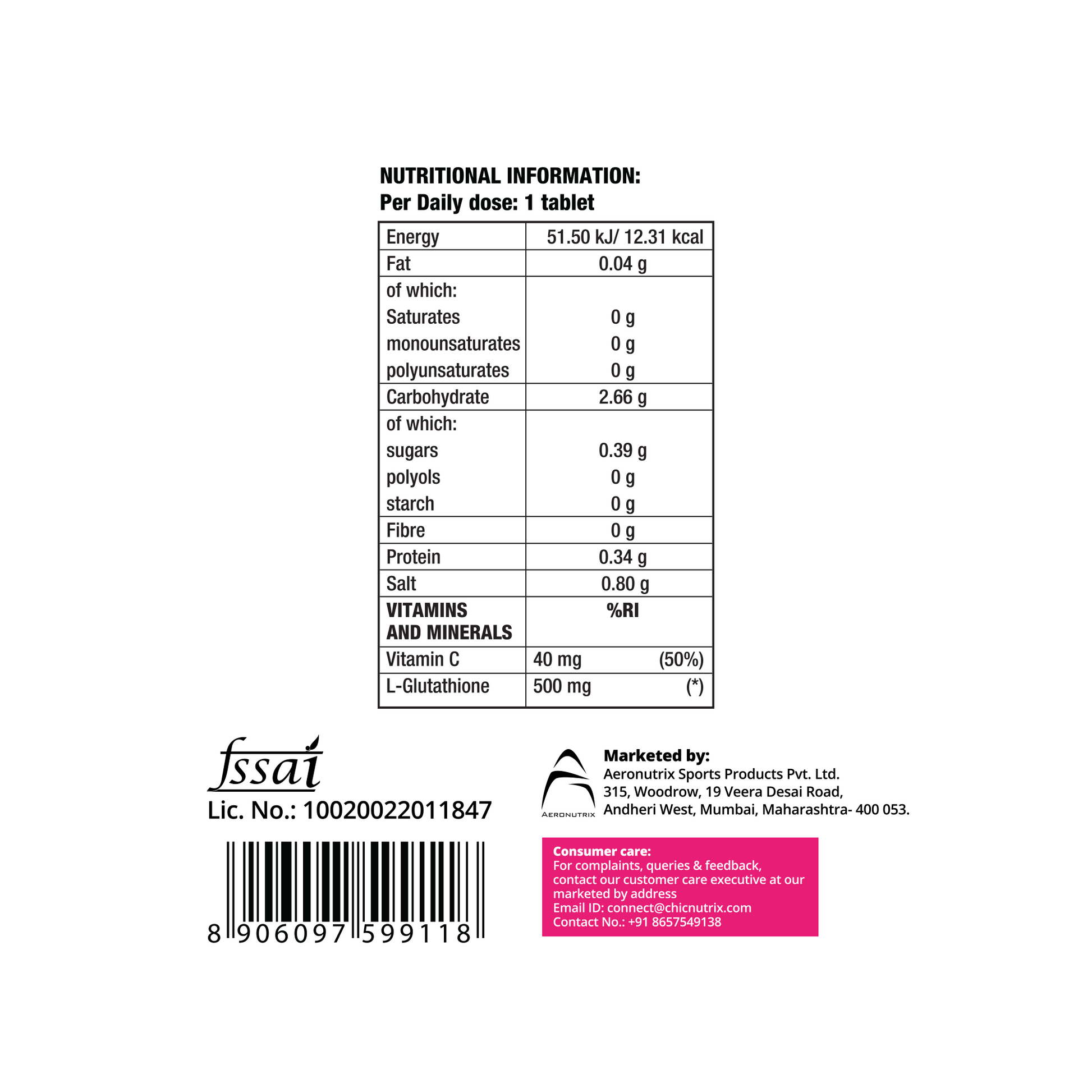 To address this, Glutathione tablets offer a convenient way to supplement your diet and maintain your skin's natural glow. However, the absorption of oral Glutathione has traditionally been a concern, particularly with lower quality products on the market. Chicnutrix Glow contains Japanese OPITAC™ Glutathione, clinically proven for its superior absorption even when taken orally. It helps inhibit tyrosine activity, reducing dull skin cells (eumelanin) while promoting bright skin cells (pheomelanin). Vitamin C is also included to enhance Glutathione absorption and efficiency.