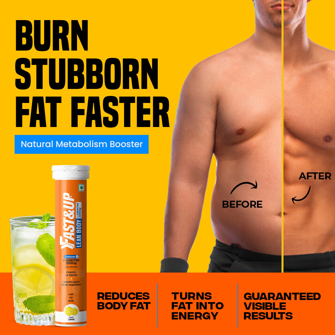 Purest, High-Quality L-Carnitine Tartrate 2000mg with Fast Absorption & Action which helps convert fat into energy. It is sourced from Clinically Researched and Tested World’s best manufacturer of L-Carnitine, CarnipureTM - Trademark of Lonza, Switzerland and is formulated with Swiss Effervescent Technology. Fast&Up L-Carnitine Lean Body is completely safe, highly bioavailable, gentle on stomach and is available in tasty lemon and orange flavours. Effervescent Fast&Up L-Carnitine Lean Body acts as a fuel to carry stored fat to the mitochondria where it is burned and converted into energy.